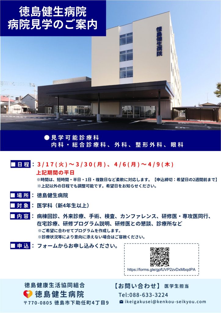 徳島健生病院では、新4年生以上の医学生を対象に病院見学を実施しております。